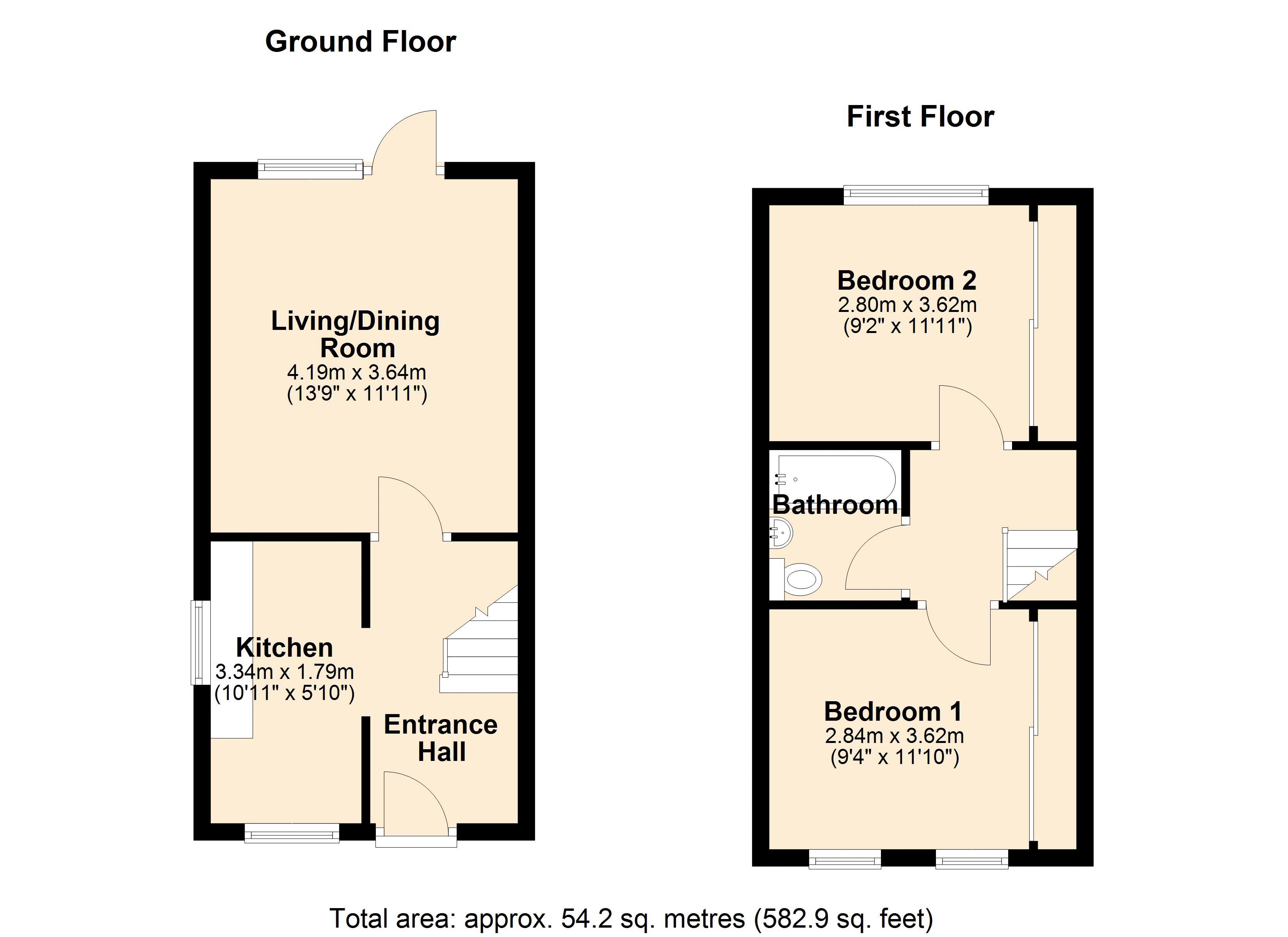 The ground floor includes an entrance hall leading to the kitchen and a spacious living/dining room, with a lean-to at the rear providing useful additional space. Upstairs, there are two generous double bedrooms, each featuring fitted wardrobes, along with a family bathroom in need of updating.
