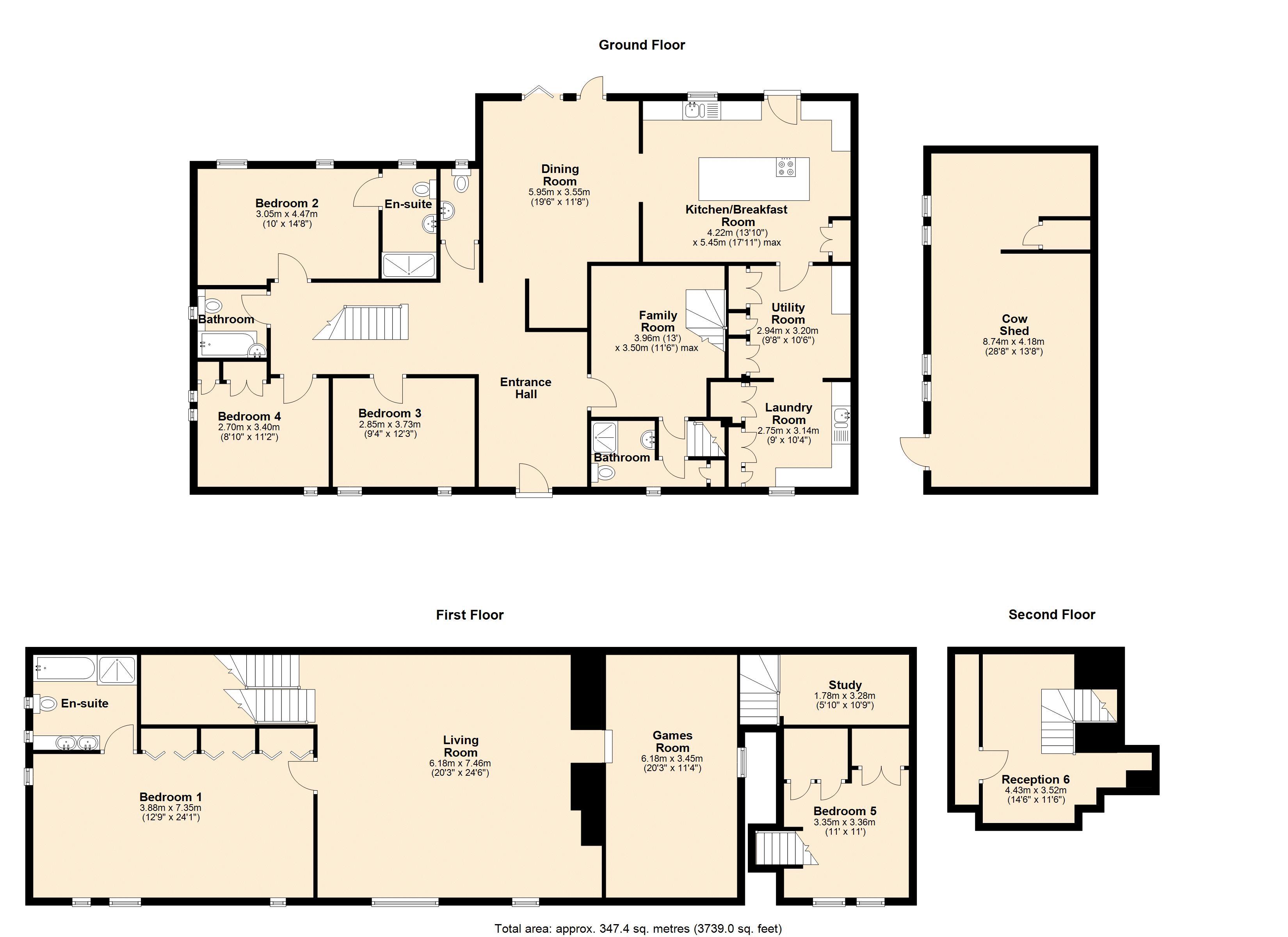 From the entrance hall, stairs lead to a striking living room with a vaulted ceiling, exposed beams and a feature fireplace with a log burner, creating a superb focal point. The principal bedroom suite, with en-suite bathroom, is accessed from this space, along with stairs leading to a playroom/games room, dressing area and additional storage.