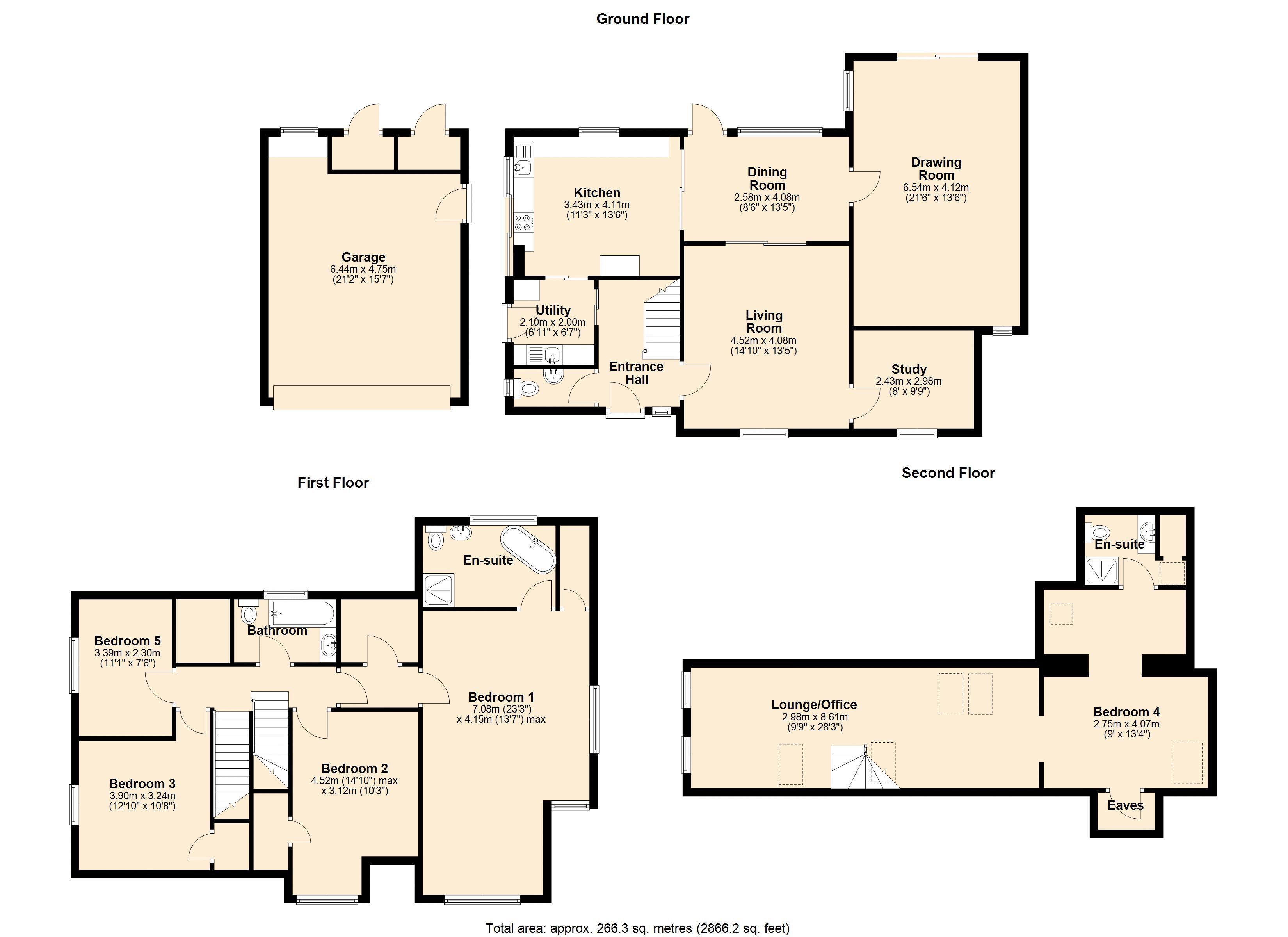 The second floor adds further versatility, currently arranged as a spacious reception area used as a lounge and office. This flexible space leads through to an additional bedroom suite complete with dressing area and en-suite, making it ideal for guests, older children or multi-generational living.