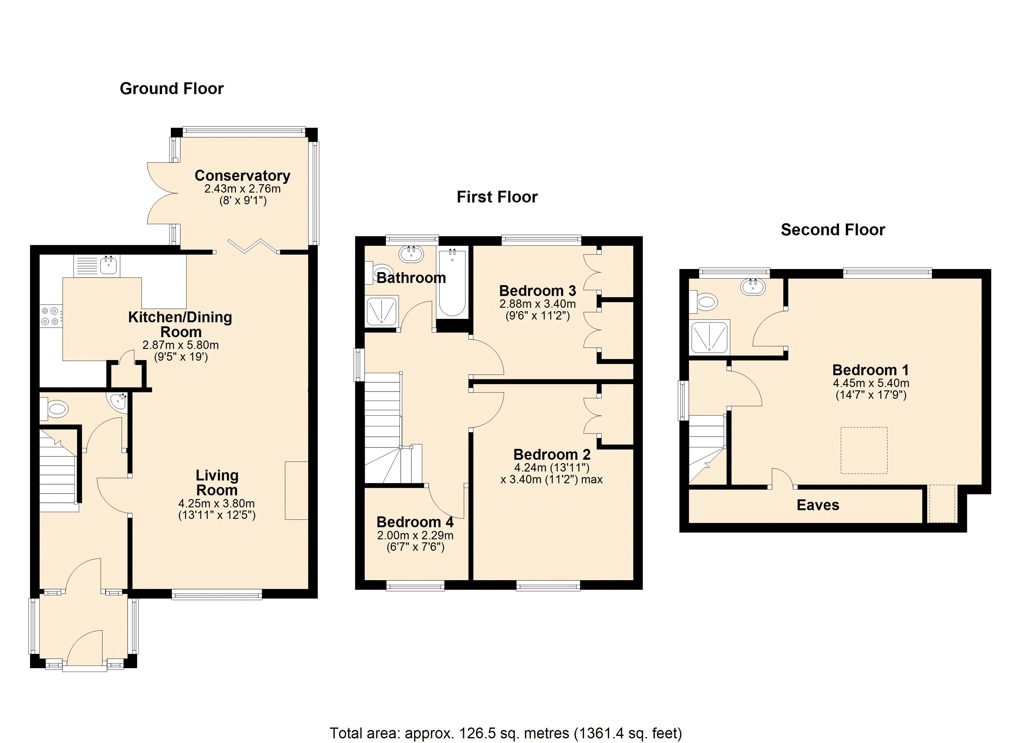 On the first floor are three bedrooms, including two comfortable doubles and a further single room, served by a family bathroom. The second floor is dedicated to the principal bedroom, complete with an en-suite shower room and useful eaves storage, offering a private retreat away from the main living areas.