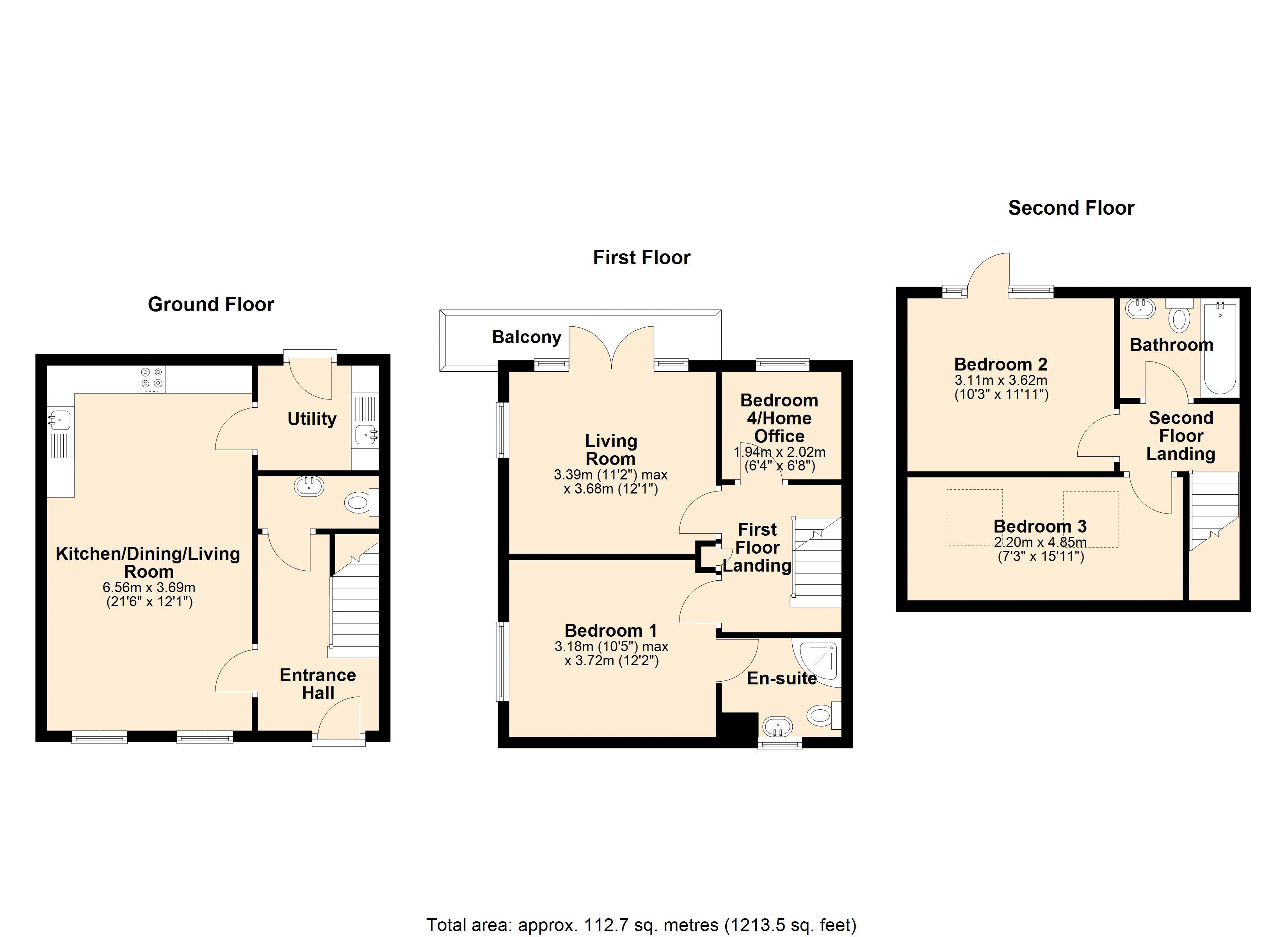 A welcoming entrance hallway leads to a convenient cloakroom, a generous open-plan kitchen/dining/living room, and a practical utility room. This sociable space is perfect for day-to-day living and entertaining. The first floor includes an airing cupboard and opens to the stylish principal bedroom with ensuite, a bright living room featuring its own balcony and bedroom4/home office, offering excellent work-from-home potential. The top floor provides two additional bedrooms, ideal for children, guests or hobbies and a modern family bathroom.