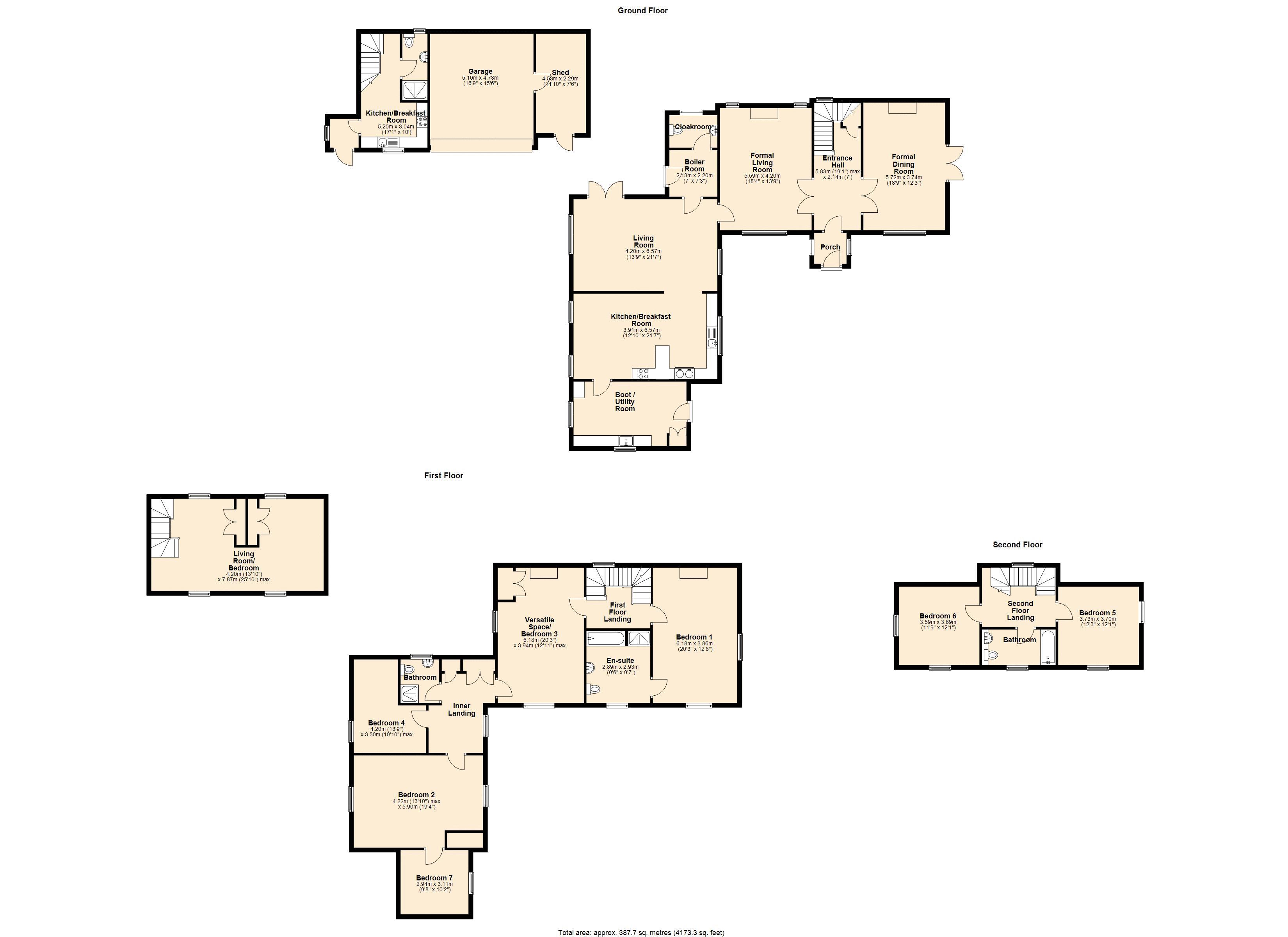 On the first floor, the expansive layout continues with a principal bedroom suite with en-suite bathroom, three further bedrooms, spacious landing with airing cupboard storage, shower room and an additional snug room which could serve equally well as a study, nursery or walk-in wardrobe. The second floor offers two further large double bedrooms along with an additional family bathroom.
