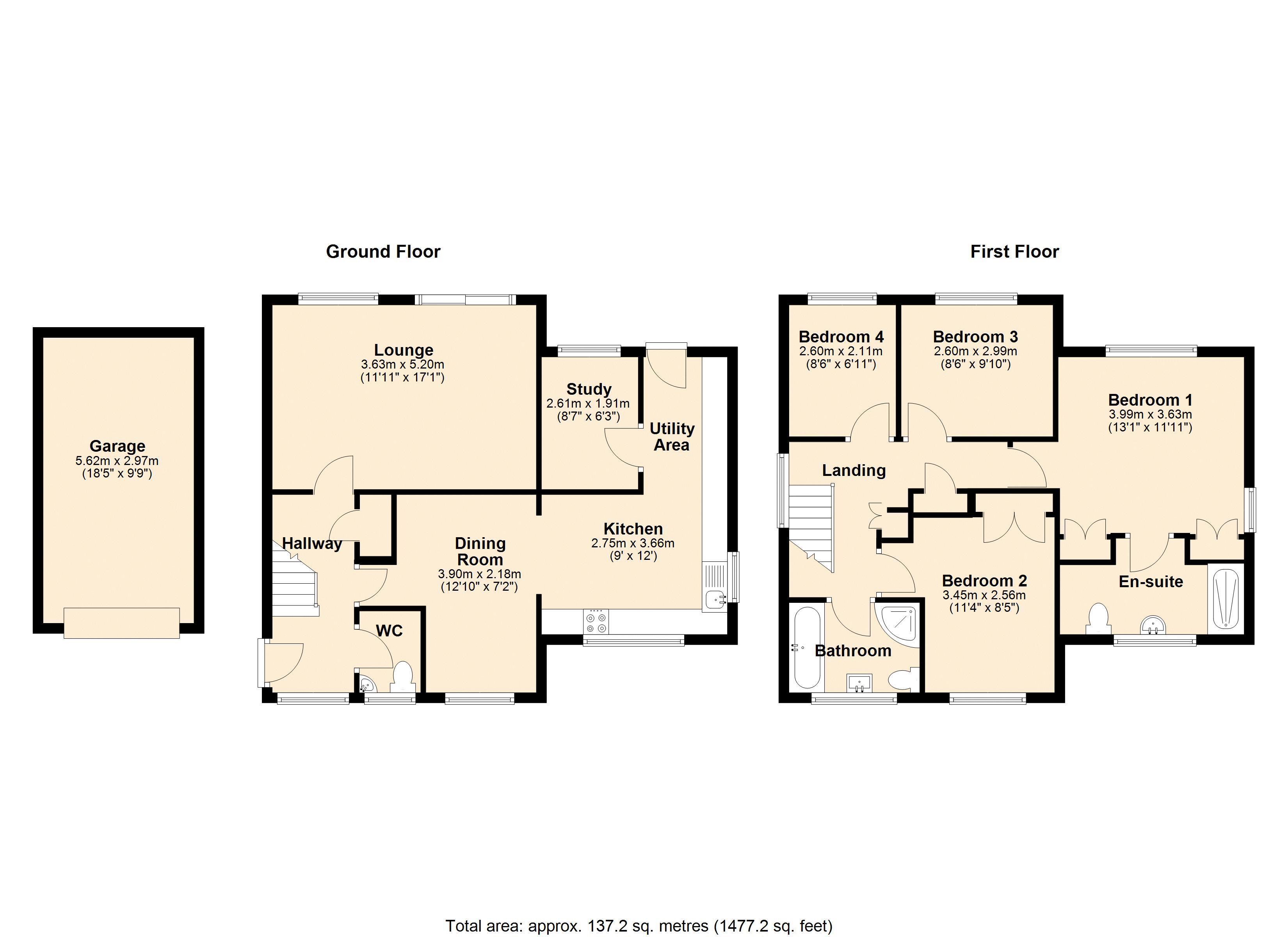Additional ground floor accommodation includes a well-proportioned study, ideal for home working and a downstairs cloakroom. Upstairs, the home continues to impress with four well-sized bedrooms. Three are comfortable doubles, while the standout master suite enjoys a dual aspect, built-in wardrobes, and a modern en-suite shower room. The layout is well-planned with ample built-in storage and cupboards throughout.